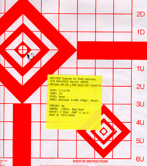 Click on Thumbnail for a better view. This is the first rounds fired though the barrel to establish the accuracy potential of the gun using factory ammunition as a standard. TH. Here is a target fired by the NSP. Click on Thumbnail for a better view. Pricing: P.O.R. |