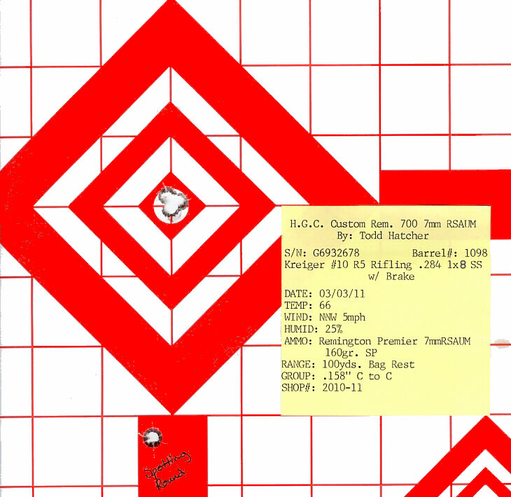 Click on Thumbnail for a better view. These are the first rounds fired through the barrel to establish the accuracy potential of the gun using factory ammunition as a standard. I feel that with a proper break in period and good handloads the gun is capable of shooting better groups than this. TH. Pricing: $5000.00 w/o Scope, Base & Rings (Price subject to change without notice). |