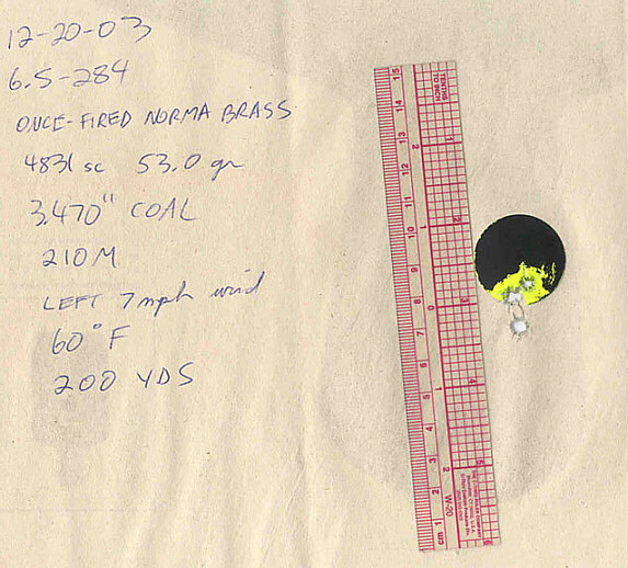 This 1/4-moa group was the first 200-yard target I ever shot with your Rem 700 Short Action 6.5-284 Norma Match rifle, a Gem-Tech